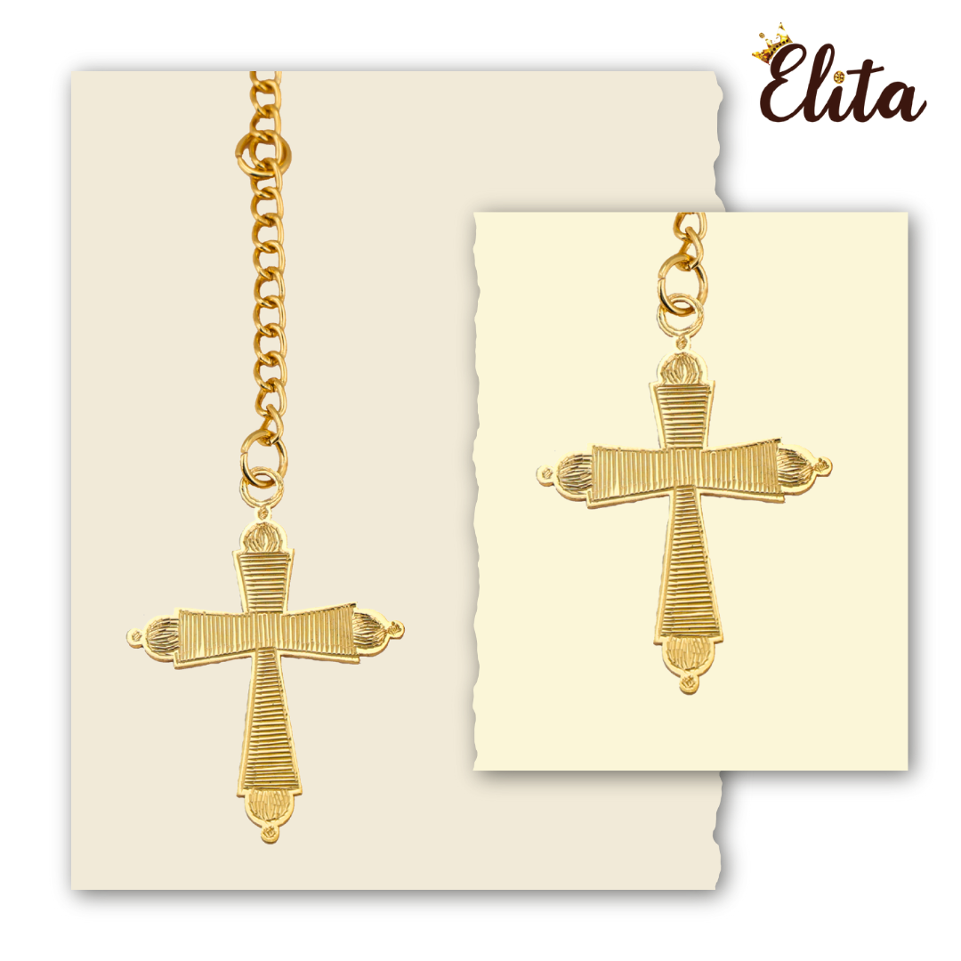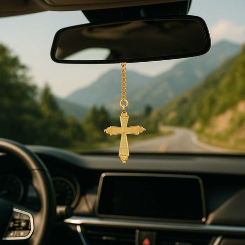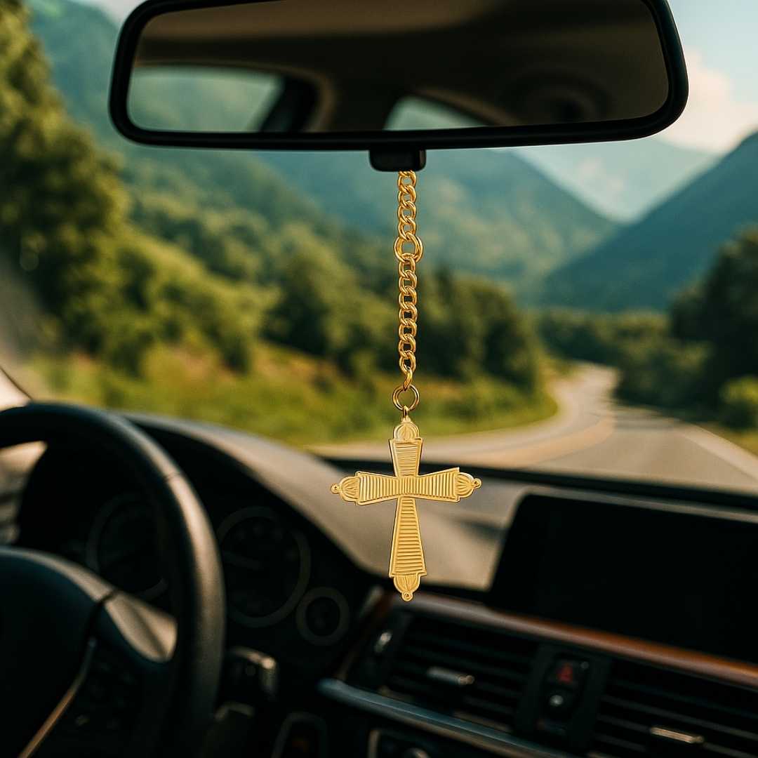 Elita Car Rearview Mirror Cross Pendant, Gold Chain Hanging Religious Ornament, Gold-Plated Finish in Brass