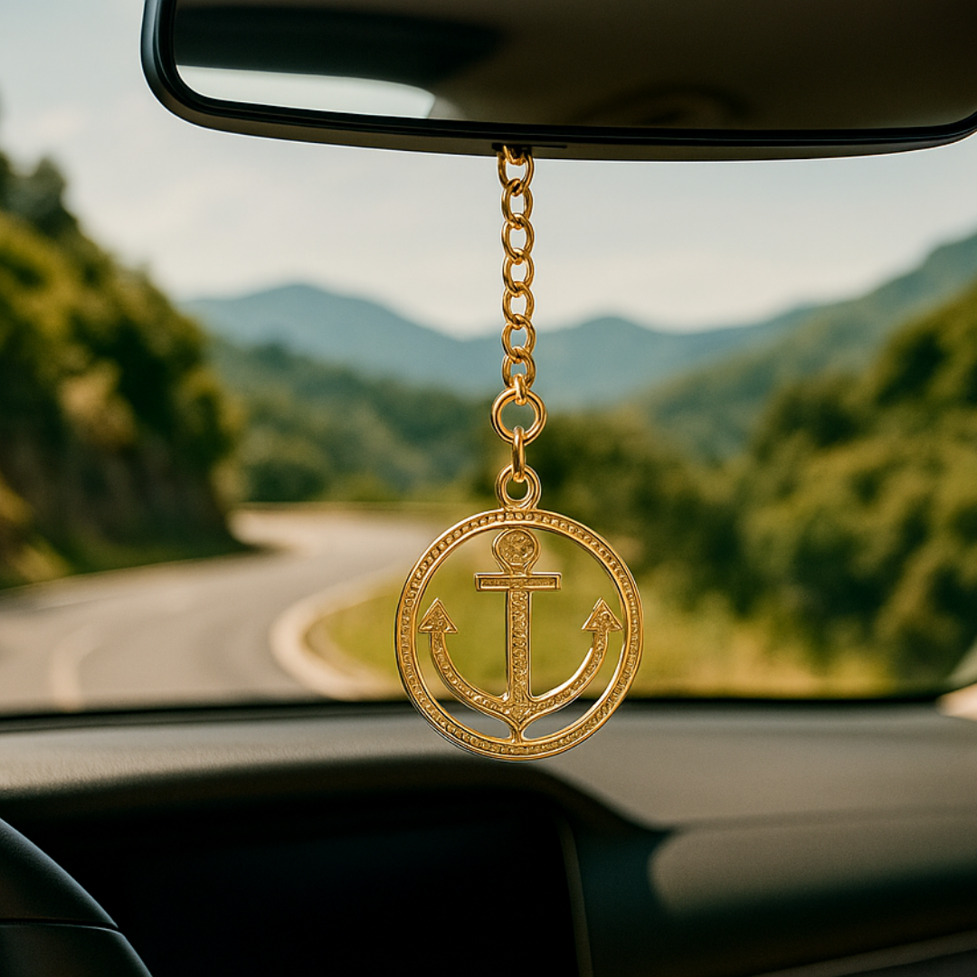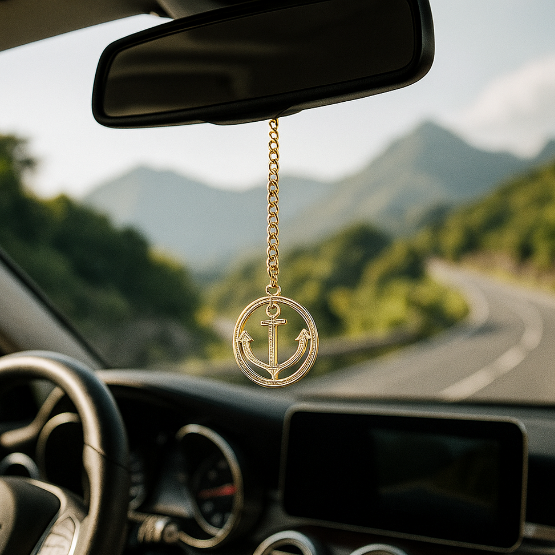 - ELEGANT DESIGN: Gold-plated anchor pendant encased in a circular frame, adding a sophisticated nautical touch to your vehicle’s interior