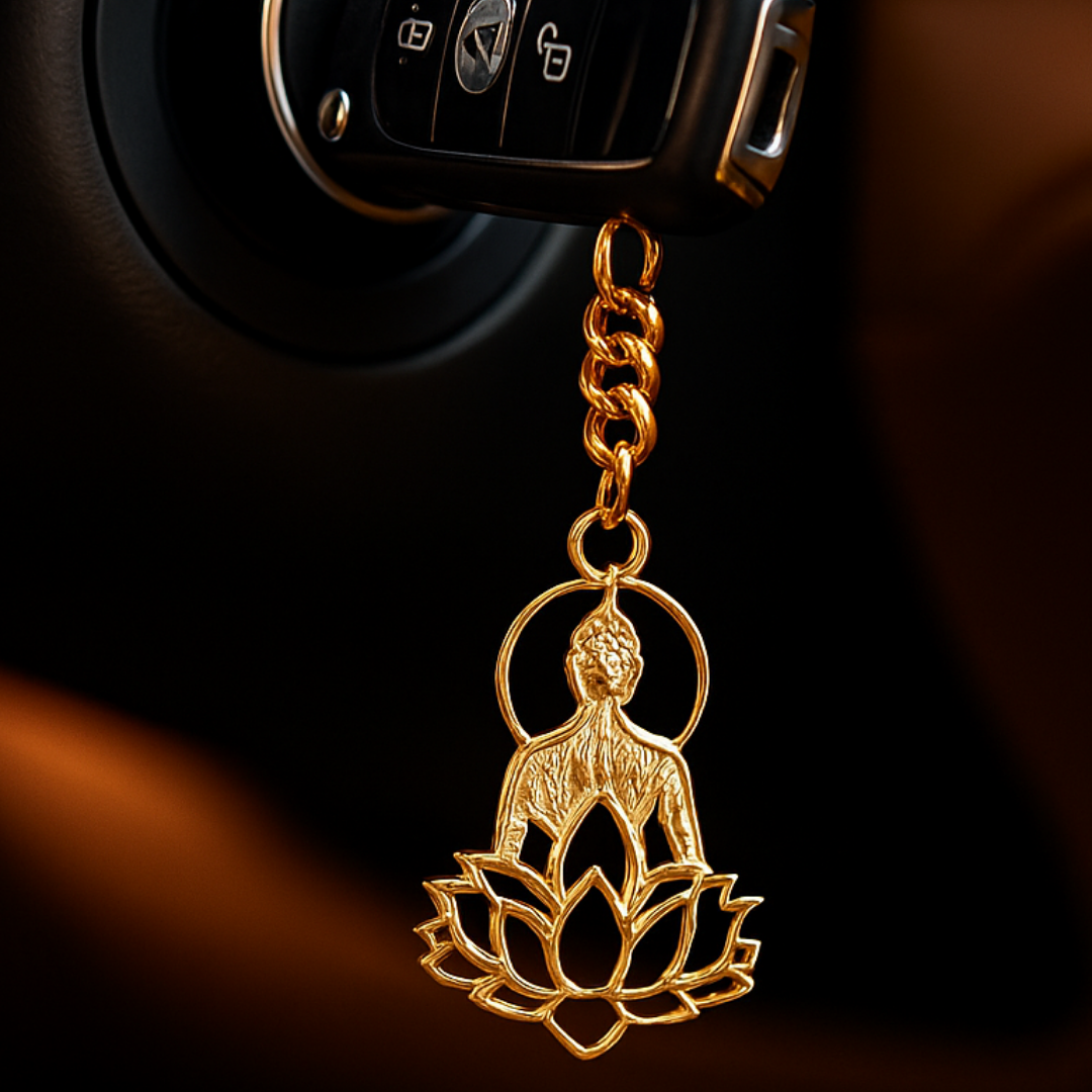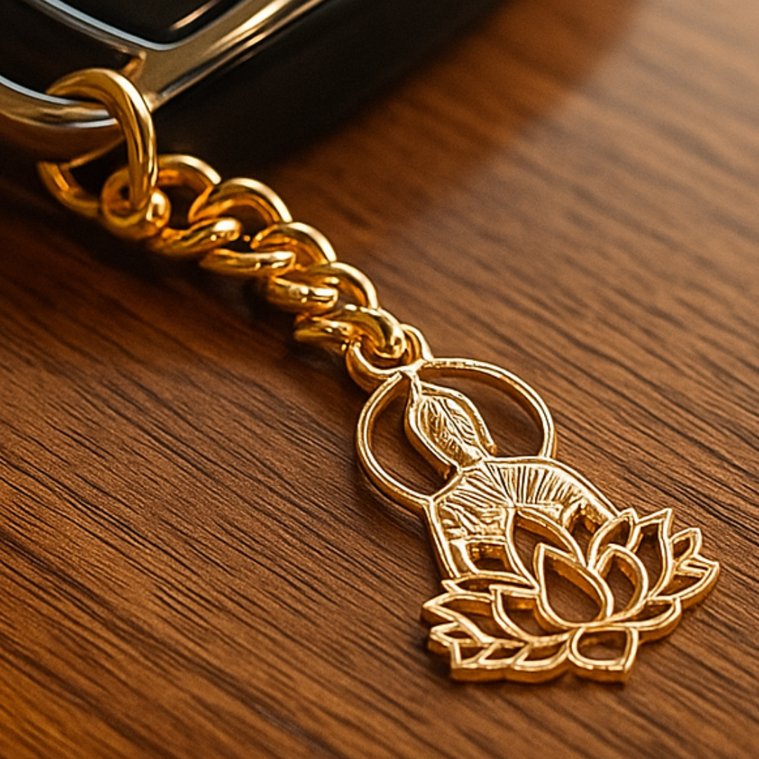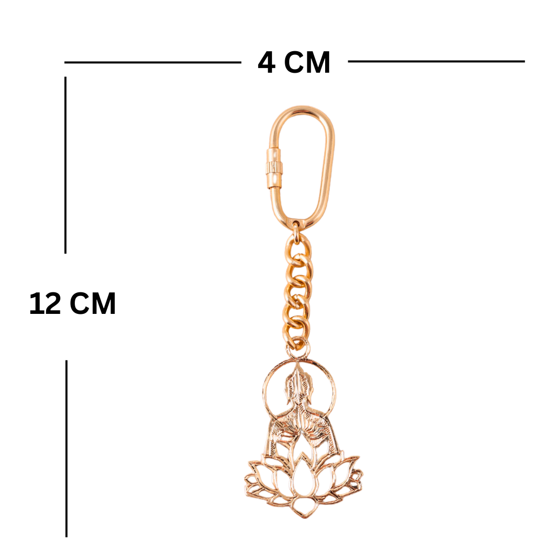 Add a touch of spiritual elegance to your daily carry with this exquisite gold-plated Buddha lotus meditation keychain. The beautifully detailed charm features a serene Buddha figure seated in meditation pose, harmoniously integrated with an intricately designed lotus flower motif. Crafted with precision in brass and finished with lustrous gold plating, this keychain combines both aesthetic appeal and durability. The sturdy chain link construction and secure clasp ensure your keys stay safely attached. Perfect as a meaningful accessory for your keys or bag, this keychain serves as a constant reminder of inner peace and mindfulness. Its sophisticated design makes it an ideal gift for those who appreciate spiritual symbolism or eastern philosophy. The combination of the sacred lotus and Buddha creates a powerful symbol of enlightenment and purity, while the premium metalwork showcases fine craftsmanship in every detail.