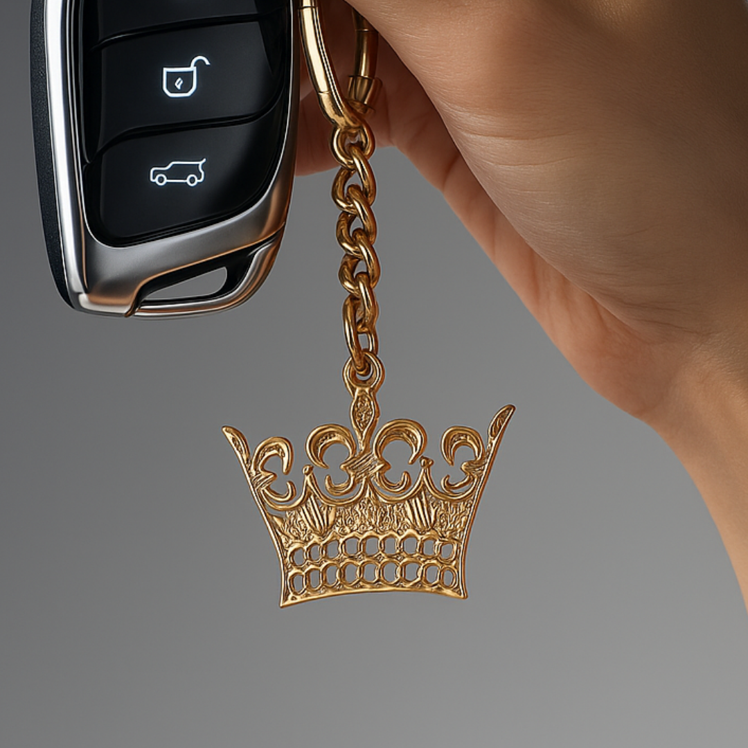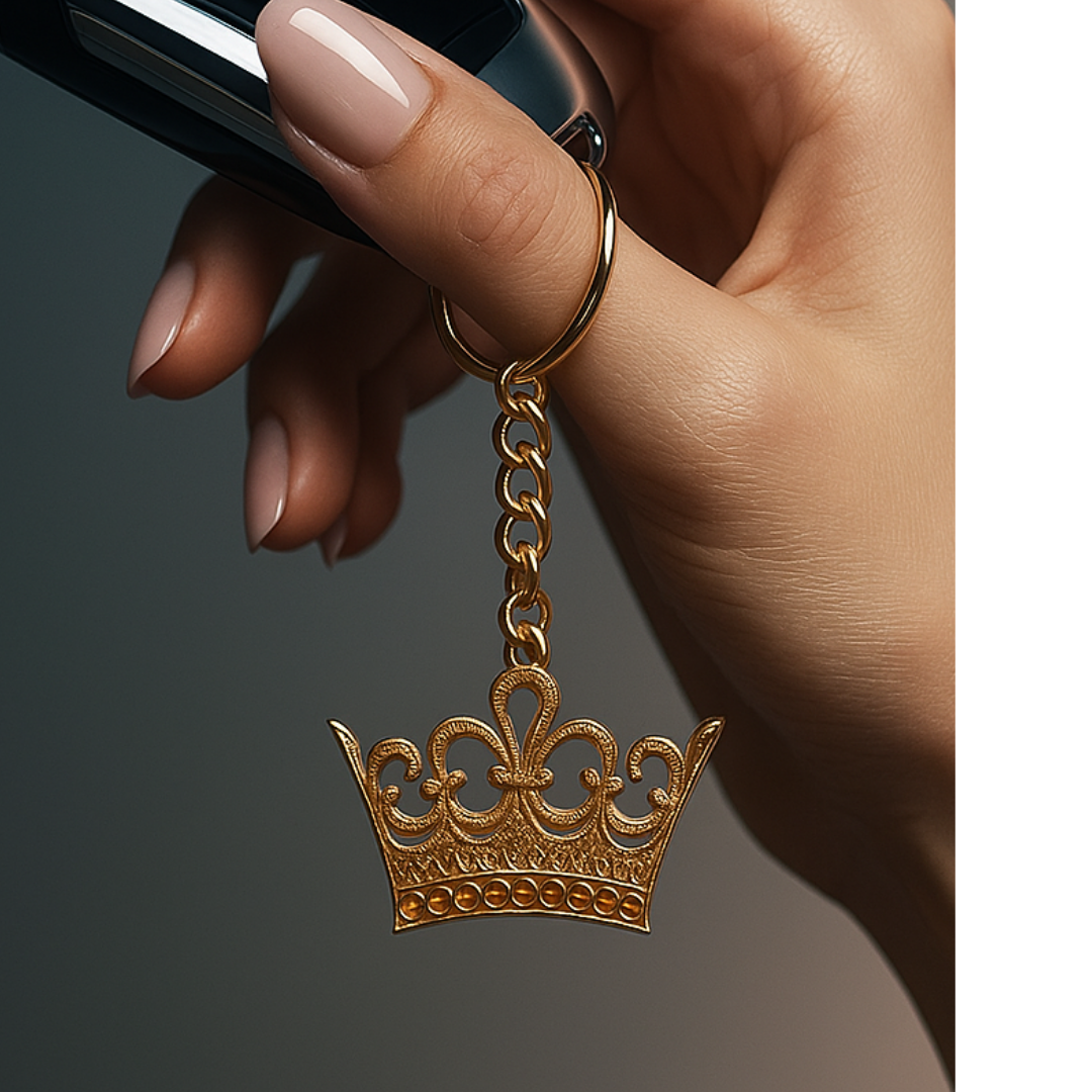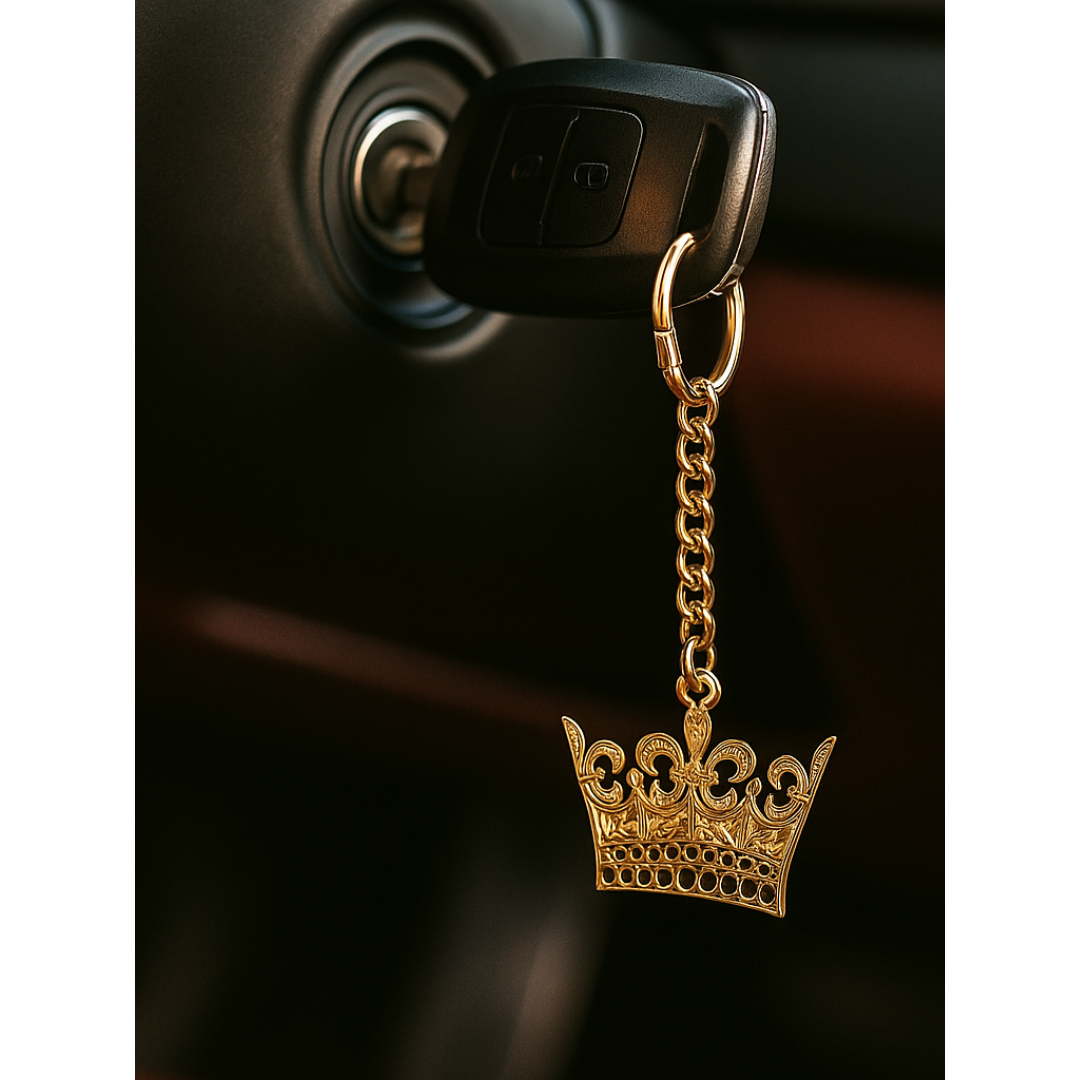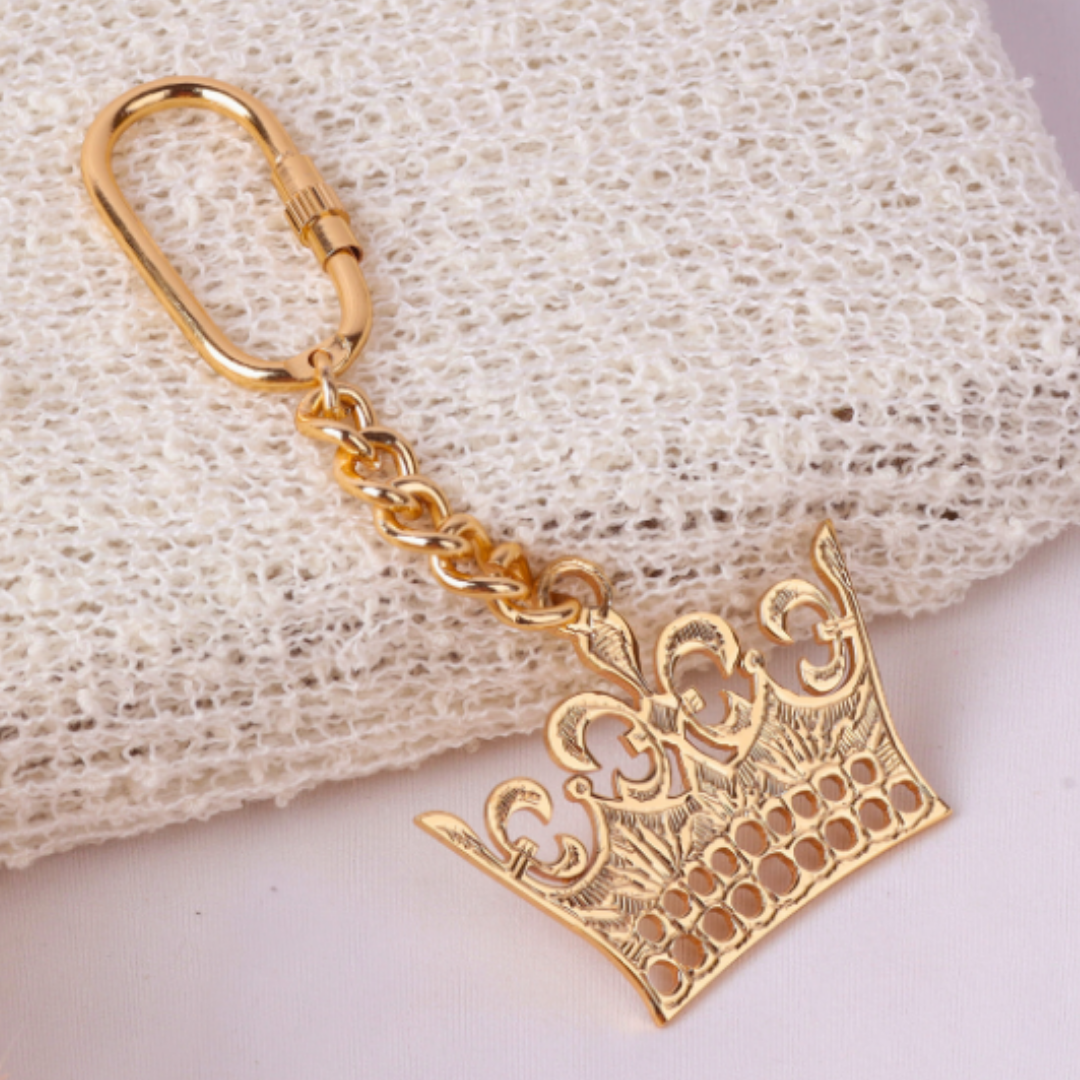 - PREMIUM DESIGN: Elegant crown-shaped charm keychain featuring intricate decorative patterns and a luxurious gold-tone finish