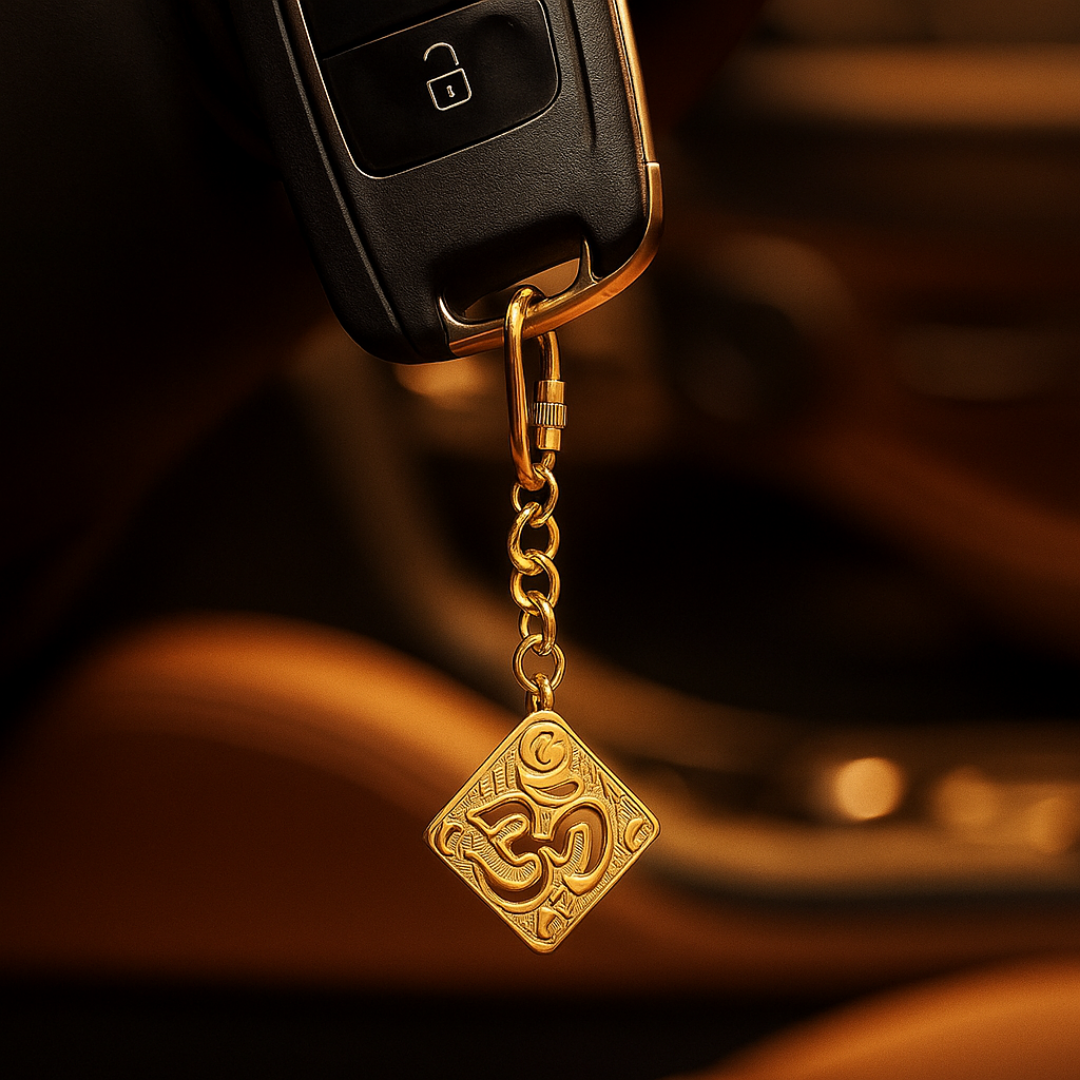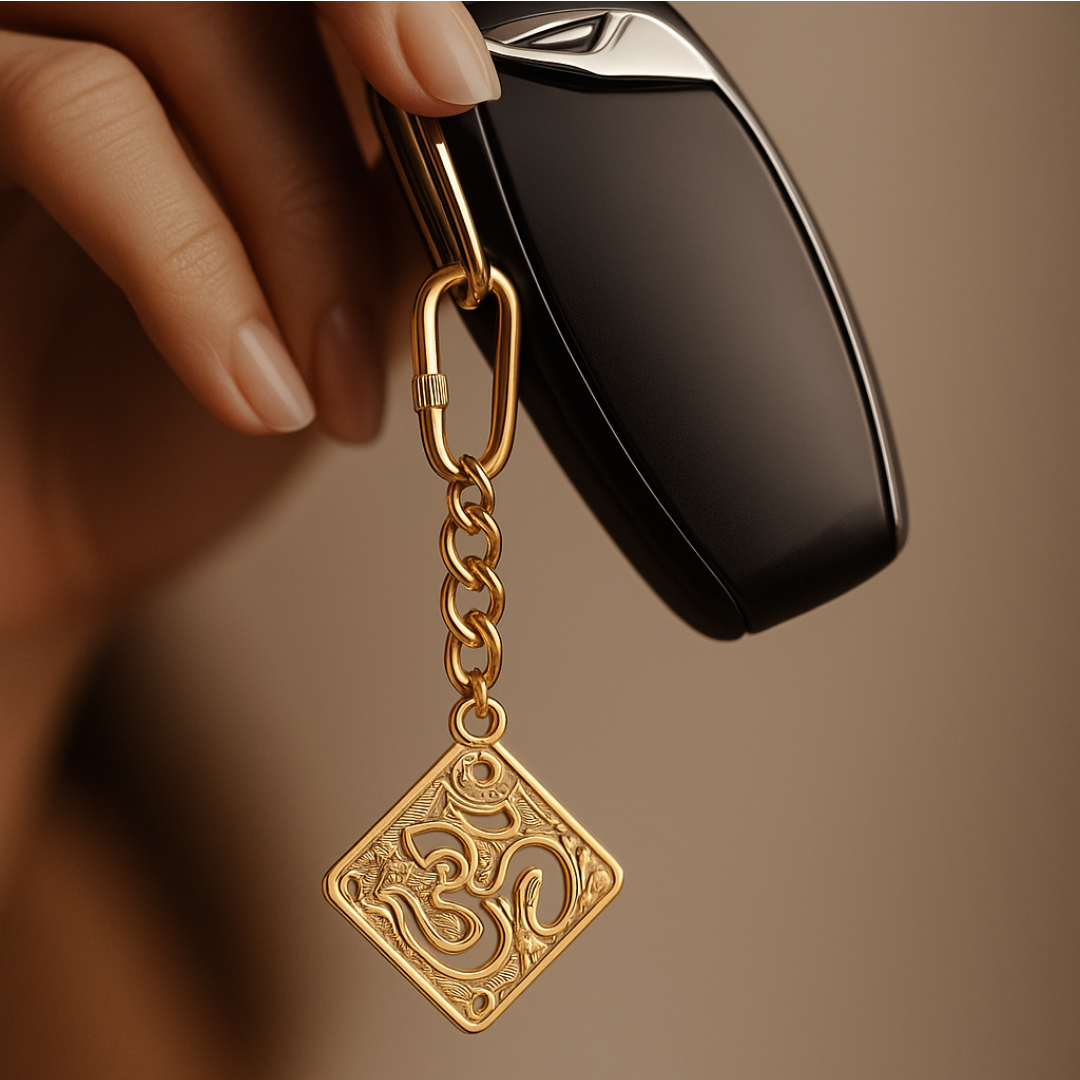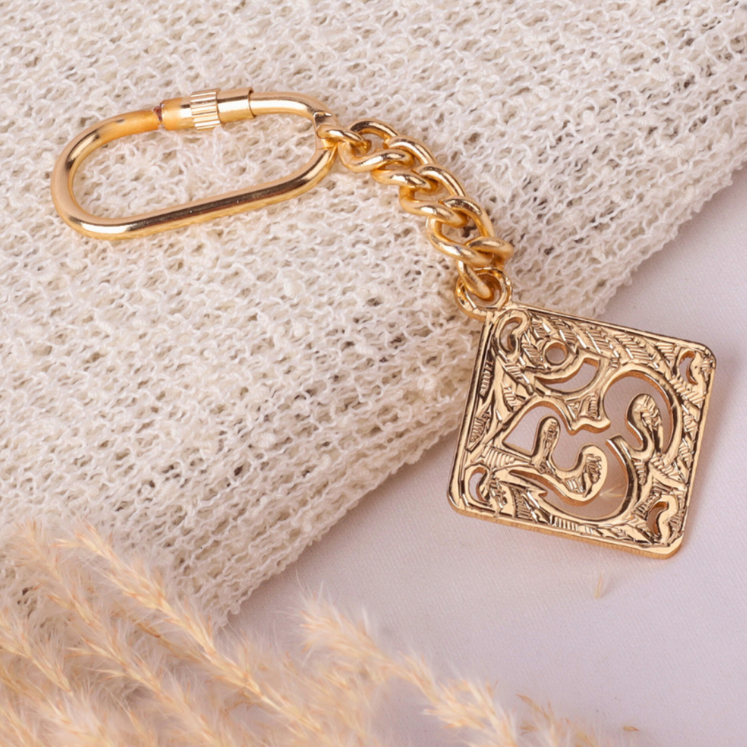- ELEGANT DESIGN: Gold-plated brass keychain featuring an intricately detailed square filigree Om symbol pendant with decorative cutwork pattern